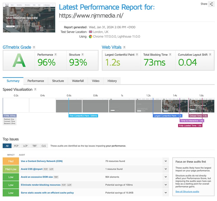 Het handige aan GTmetrix is dat je in één oogopslag ziet hoe je website scoort op de: