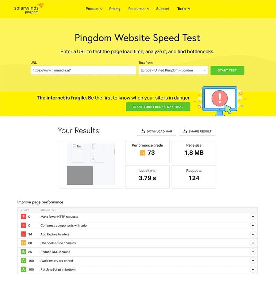 Pingdom is na PageSpeed Insights één van de meest gebruikte tools om je website snelheid te testen. In tegenstelling tot PageSpeed Insights voert Pingdom echte snelheidstesten uit. Het is mogelijk om vanuit de volgende locaties de test uit te voeren: